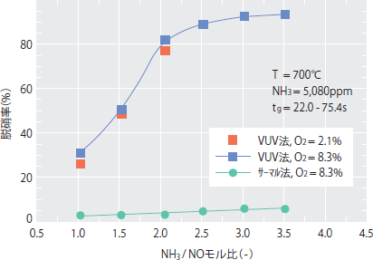 高温域にアンモニアを吹き込む従来のSNCR法(以下、従来型SNCR法)では、脱硝反応の開始温度は750°C以上である。これに対し、励起アンモニアSNCR法では、600°Cから脱硝反応が開始し、酸素濃度8.3%、NH3/NOモル比2.0、操作温度700°Cで脱硝率が約80%に達した。