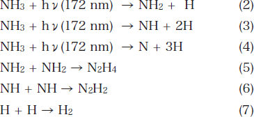 波長172nmのアンモニアの吸収係数は59atm-1cm-1 21)であり、アンモニアはエキシマ光(172nm)の照射によって励起される。窒素は172nmに対して不活性である。本研究において、VUV照射で生成される化学種を励起アンモニアという。