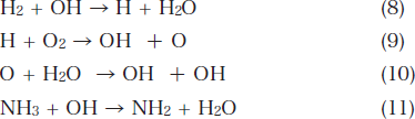 次に、主な反応フローを示す。850°C以上でアンモニアがヒドロキシルラジカル(OH)と反応し、アミドゲンラジカル(NH2)を生成する。次にNH2とOHが反応し、脱硝が起こる。脱硝にはNH2ラジカルの存在が最も有効であるため、アミドゲンラジカルを添加すれば、脱硝反応温域を下げられると推論できる。