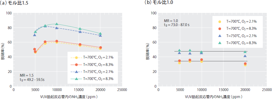従来型SNCR法に比べ、VUV励起アンモニアSNCR法では、脱硝反応温域が拡がり、脱硝開始温度も低下した。脱硝は600°Cから開始し、反応温度の上昇にほぼ比例して増加した。反応温度が700°C、モル比2.0では、脱硝率は約80%に達した。酸素濃度については、濃度を2.1~8.3%に増加しても、脱硝率の増加は5%程度に留まり、酸素濃度の脱硝率への影響はほとんど認められなかった。これに比べ、モル比の脱硝率への影響は大きかった。モル比1.0~3.5の領域では、脱硝率は対数的に増加した。