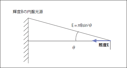 次に、円盤光源が観測点より半角θで見える位置にあり、輝度が等方一様で B である場合、照度はE =∫∫Bcosθsinθdθd¢=πBsin2θになり、E=πBsin2θとなります(図2)。これが第二の式です。