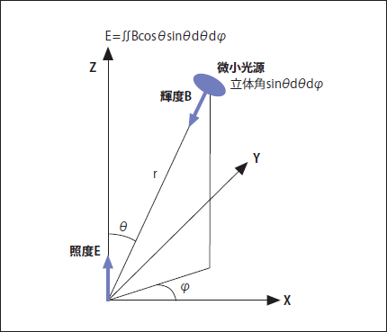 ここからが3つの式になりますが、上記のことを、極座標(r,θ,¢)で表現すると、照度はE=∫∫Bcosθsinθdθd¢になります(図1)。これが第一の式です。