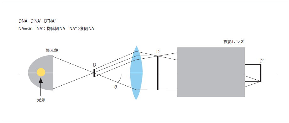 投影レンズの倍率とNAの関係はこの式そのものですが、この式は、結像関係が無い場合にも成立します。図3で言えばDNA=D′N′A′です。図3のような集光鏡を使用した光学系では、例えば、投影レンズの像側NA=0.1、像の直径100mmであれば、途中の光学系はどうあれ、DNA=D″N″A″であり、集光鏡に同じような考え方を適用すれば、光源の光を有効に利用するには、光源のサイズは5mm程度である必要があることが分かります。それ以上の大きさの光源の光は利用出来ません。光源の光出力がいかに大きくても、そのサイズが大きいと、光を有効に利用出来ず、像面の照度を上げることが出来ない、という結果になります。