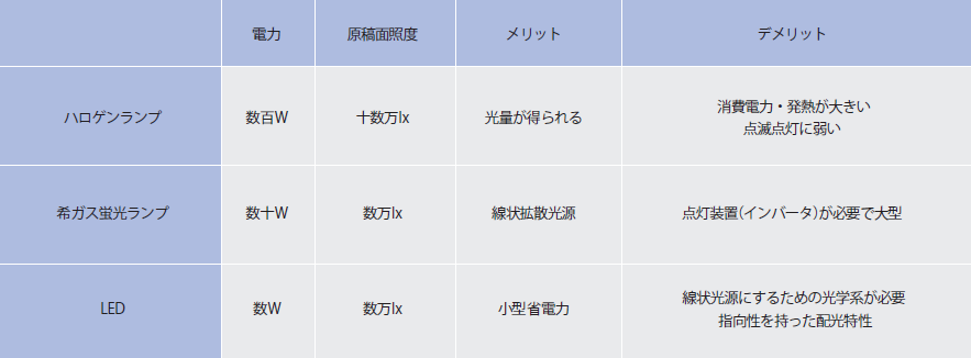 表1:複写機で使用される原稿読み取り用光源の特徴