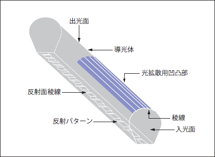 線状の導光体の端部にLEDを取り付け、照明する方式(図4)である。LEDの使用数が少ないため、発熱による発光効率の低下が懸念されるが、上記のアレイ方式の問題点である配光特性のリップルや経時変化などの問題は解消される。