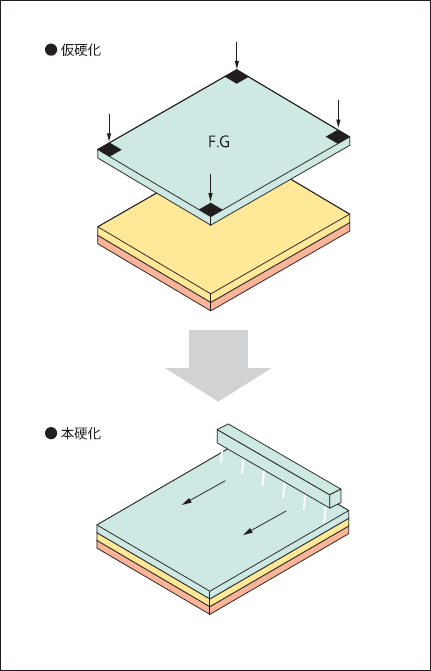 まず、2枚のパネルを貼り合わせた直後に仮固定が行われる(以下このプロセスを“仮硬化”と呼ぶ)。パネルがずれない様にするためである。固定方法はいくつかあるが、点で数箇所固定する場合には「スポットキュア」、全面で固定する場合には「ユニキュア」が使用されている。仮硬化においては、完全に固めるわけではないので、剥がしてやり直すことも可能である。