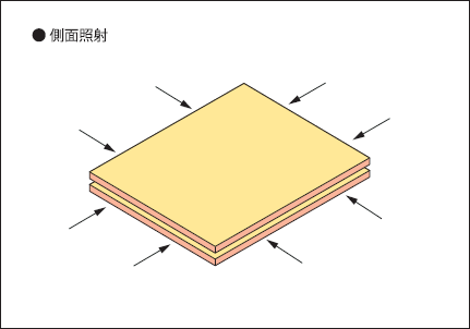 仮硬化と本硬化のプロセス以外に、“側面硬化”を取り入れるユーザもある(図7参照)。貼り合わせた後、上方からのUV照射のみでは印刷の下が固まりにくいという問題があるためだ。