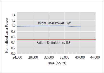 The life test result in Fig. 3 demonstrates that the laser output power is almost the same as the initial after 19,400 hours under the accelerated test condition of Tnecsel = 50°C, corresponding to 38,800 hours for the rated temperature of Tnecsel = 40 °C.