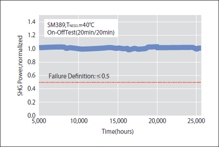 The above data, in additional to other reliability data, gives us confidence that our laser s meet the targeted digital cinema application specifications of over ten year of use. This assumes these are used ten hours per day, seven days per week, and 50 weeks per year, which would be very typical for cinema projection applications.