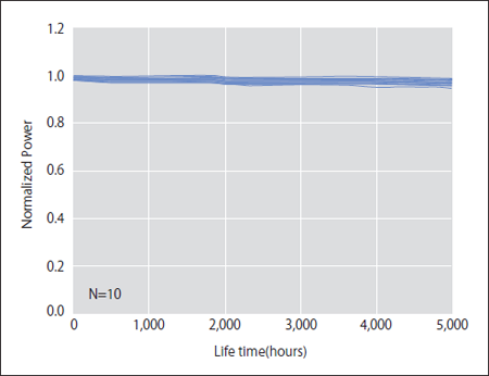 Necsel performs many different tests on its products to ensure that infant mortality is weeded out, ongoing failure rate is low, and wear out meets the requirements of digital cinema -- over 10 years (35,000 hours) of operation. To ensure reliable designs, each of the devices goes through many military standard tests: from on-off cycling, mechanical shock, mechanical vibration, temperature cycle, high temperature storage operating life test and others. Below are examples of life test and on-off cycling tests. For all life tests, input drive current was fixed and laser output power was monitored.