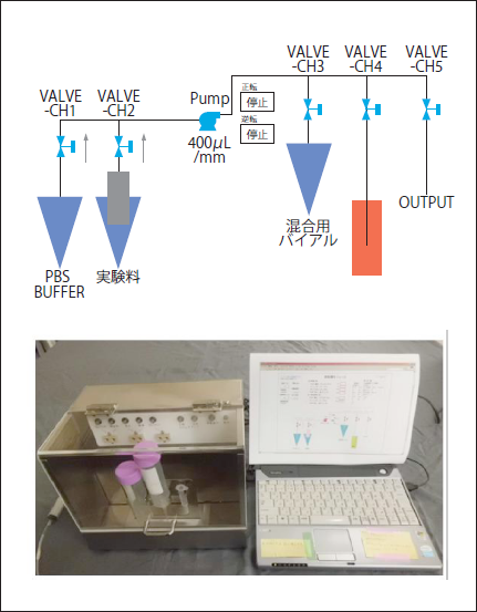 また、Fig.2には、本研究で開発した自動的に尿試料を前処理するためのモジュールを示した。尿の前処理のために、市販されている尿の前処理フィルタのMonoSpinを用いた。MonoSpinは装置の溶液導入部に固定化しており、ペリスタポンプの吸引によって尿試料を濾過する。また、実際の尿のpHは、4.5から7.5の範囲でばらつきがあるため、そのままでは電気化学測定を行うのは難しい。そこで、リン酸緩衝溶液と1:1で混合することによって、電気化学検出部には、pH7.4の溶液が流通するように設計した。