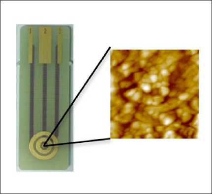 Fig.1 Electrochemical biosensor chip and the surface image(200nm x 200nm).