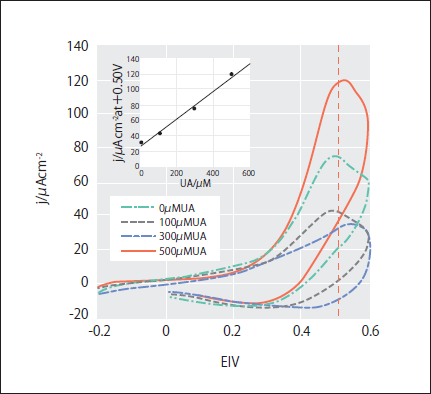 また、本研究では、作用電極として、FcC6SHSAM修飾電極を用いている。このFcC6SHSAMを使った尿酸の電気化学反応では、電極表面へ固定化したフェロセンがメディエーターとして機能して、尿試料中の尿酸を電気化学的に酸化する。このときの酸化電流から尿試料中の尿酸を定量した。+0.5 V vs. Auでのピーク電流をプロットすると、0から500μMの濃度範囲で、直線の検量線を得ることができた。健康診断で求められる尿酸の指標は150から450μMの範囲であることから、本研究で開発した電気化学バイオセンサチップは、実用で使用することができる検出感度があることがわかった。