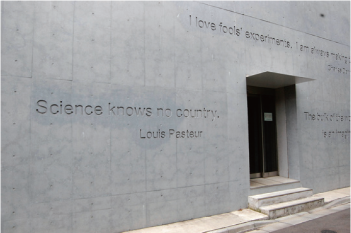 ▲R1棟入口壁面に刻まれた言葉「科学に国境はない」言葉の主Louis Pasteurは、ロベルト・コッホとともに「近代細菌学の開祖」と言われ、分子の光学異性体を発見し、牛乳、ワイン、ビールの腐敗を防ぐ低温殺菌法(パスチャライゼーション・低温殺菌法とも)を開発した。また、ワクチンの予防接種法も開発し、狂犬病ワクチン、ニワトリコレラワクチンを発明している。