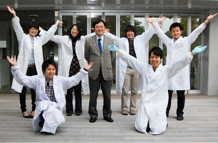▲抗体のY字ポーズで上田先生(中央)を囲む研究室の皆さん