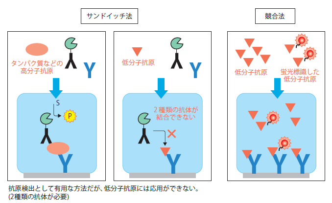 抗原検出として有用な方法だが、低分子抗原には応用ができない。