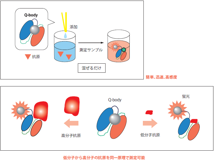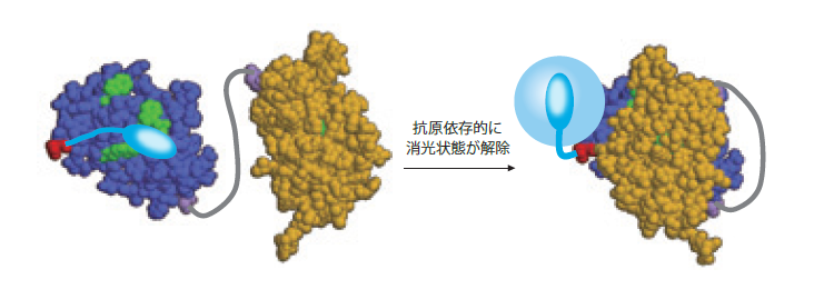 これらの問題や課題を根本的に解決しうる測定法が、簡便・迅速・高感度な「新規蛍光免疫測定素子(Q-body)」である。この新規の測定法は、図2に示すように、抗体分子内の保存性の高いトリプトファン(または別の蛍光色素)により色素が消光(Quench)し、それが抗原依存的に解除され、蛍光発光するという原理に基づいている。