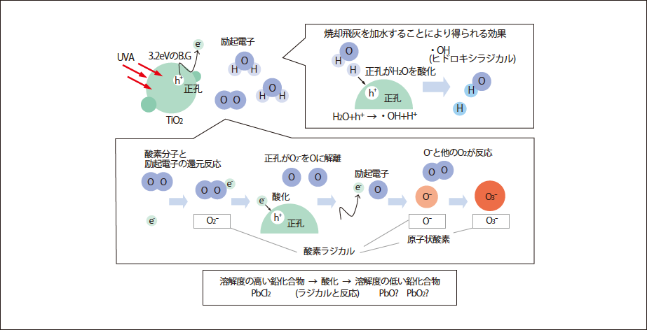 著者らは、一般廃棄物焼却残渣(焼却主灰や焼却飛灰)中に高濃度で含有する鉛を不溶化させる手法として、これまでに紫外線に着目した検討を行ってきた1)-4)。その結果、図-1に示すように紫外線を焼却残渣に照射させることで、pHを低下させることなく鉛の溶出濃度を低下出来ることを発見し、そのメカニズムは、図-2に示すように、焼却残渣中に含まれるTiO2を利用して活性酸素を生成させ、溶解度の高い鉛化合物を酸化させ鉛酸化物へと形態変化させる手法であることを実験的に示している1)-4)。しかしながら、この手法は不溶化までに時間を要すること、焼却残渣中に含まれるTiO2をはじめとする金属酸化物半導体の存在が必要であること、紫外線を灰粒子に万遍なく照射させる必要があること等、実用化に向けて課題が残されている。そこで今回、本不溶化メカニズムを応用させ、活性酸素に着目した不溶化手法の検討を行った。すなわち、焼却飛灰等に元々含まれるTiO2に頼ることなく、意図的に原子状酸素を発生させ、不溶化効果を促進させる新しい不溶化処理手法の検討を行った。
