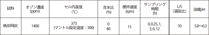 本研究では、不溶化効果に寄与する因子として、1)オゾン濃度及びセル内温度の影響と、2)不溶化効果に含水比の影響に着目して実験的検討を行った。いずれの条件も、不溶化処理を終えた後にテストセルから焼却飛灰を採取し、1)の条件ではL/S=50の下で1時間振とう、2)の条件ではL/S=10の下で6時間振とうさせ、減圧濾過(フィルター孔径:0.45µm)を行って検液を作製し、ICPプラズマ発光分析装置(ICP7000-Ver.2:島津製作所)を用いて鉛を定量している。
