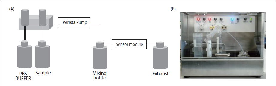 センサの信頼性を調べるために、多くの研究では検量線を作成して検出限界を求める。しかし、この検量線の作成にあたり、人の手による部分に起因する実験誤差は、センサの性能とは関係がないのにも関わらず、それもセンサの誤差の範囲として考慮されてしまう。特に、バイオセンサの研究では、標準溶液を作製するために、マイクロピペットを操作して、微量の生体由来の試料の濃度を調製する。例えば、わずか1µg/mL以下の抗体や抗原から1pg/mLの試料溶液を調製するためには、3回以上のマイクロピペットの操作を行ってその濃度を調製している。そのため、回数を重ねる毎にピペットの操作誤差が積算されて、微小領域における濃度の誤差は無視できないほどの大きさになってしまうことがある。そこで本研究では、人の手を介することなく、自動的に特定の濃度の標準溶液を作製する技術の開発を行った。これまで、マイクロ流路中の溶液の切替え方式では、スイッチングバルブが使われてきたが1-3、これは他に有効な代替するものがなかったためである。しかし、スイッチングバルブでは、その構造から内部にデッドボリュームが生じてしまうため、マイクロ流路中でこの目的のために使用することは難しい。また、電磁バルブを用いたマイクロ流路中での溶液の切替え方式では、電磁バルブに常に電圧を印加しなければならないために、熱を生じさせてしまう課題がある。この熱の課題は非常に重大であり、マイクロ流路中で電磁バルブを30分間程度使うだけで、溶液温度を80°Cにまで熱してしまう。そのため、これまで電磁バルブをマイクロ流路システムやトータルセンシングシステムで用いることはできなかった。