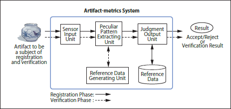 人工物メトリクスを実装したものを「人工物メトリック・システム」という。図1に基本構成を示す。微視的にみると、個々の人工物の特徴情報はすべて異なるが、その抽出は容易ではない。このため、当該システムでは特徴情報を抽出しやすくするために、人工物に材料を添加したり、当該材料に特化した情報抽出手法を用いたりすることが多い5)。