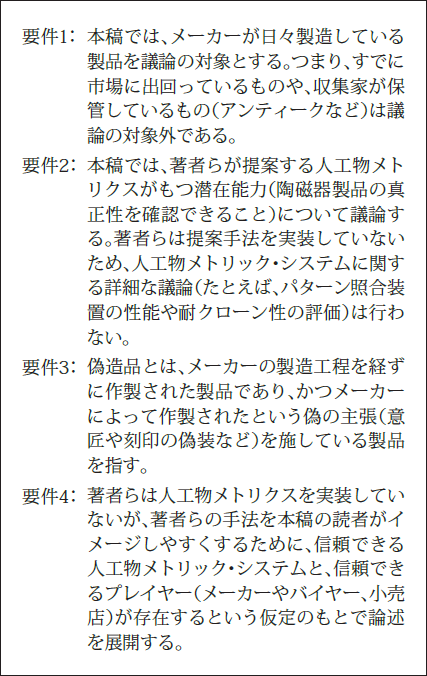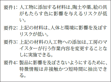 本節では、本論文における人工物メトリクスの要件を述べる。はじめに、特徴情報を抽出しやすくするために人工物(陶磁器)に添加する材料は、焼成によって生じる発色(陶土や釉薬、絵の具がもたらす発色)に影響を与えず、人体や環境に対して無害であることが望ましい。つぎに、人工物に対する材料の添加は、可能な限り工房のマイスターに追加的な作業を求めないことが望ましい。また、特徴情報を抽出する手法は、製品に影響を及ぼさないことが望ましい。以上のことから、本論文における人工物メトリクスの要件として、以下の4つを設定する。