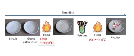 図4. Bisque-firing 後の陶磁器製品の製造プロセス。著者らは、実験1(4.1 節)に示す方法で皿を作製した。