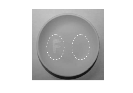 - (2)乾燥させた10枚の皿のなかから無作為に選んだ5枚の皿の表面の一部に、ガラス蛍光体の粉末とエタノールの混合液を塗布して乾燥させる。つぎに、ガラス蛍光体を塗布した部分を指で均して粒子を周囲に分散させ、ガラス蛍光体の層を薄くする(図5参照)。