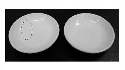図6. 左側:ガラス蛍光体を溶着させた皿(破線で囲っている部分にガラス蛍光体が溶着している)。右側:ガラス蛍光体を溶着させていない皿。