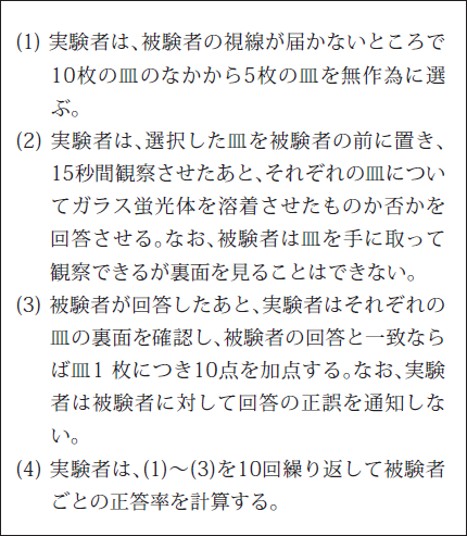つぎに、50人の被験者に対して実験の趣旨、今回使用するガラス蛍光体の特徴を説明したあと、それぞれの被験者に対して以下の要領で視認の困難性に関するテストを実施した。