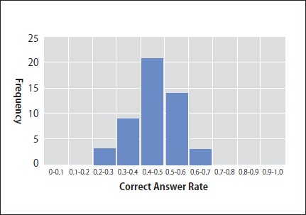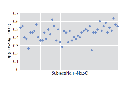 表1は、被験者ごとの正答率を散布図として表したものである(縦軸:正答率、横軸:被験者、赤線:平均値)。正答率の最高値は0.64、最低値は0.24、平均値は0.456 であった。表2は、正答率を度数分布として表したものである。正答率0.4以上0.5未満が最も多いことがわかる。これらのことから、ガラス蛍光体が少量であれば薄い青の着色を視認しにくい(ガラス蛍光体の存在を目視で確認しにくい)ため、現段階におけるガラス蛍光体には潜在的な有効性があることがわかった。