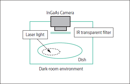 つぎに、後者(光励起による赤外線の発光)に関する実験を行う。著者らは、実験1で作製した2種類の皿について、図7に示す要領で励起光(レーザー光:808nm)を照射させながらその様子をカメラで撮影し、赤外線スペクトル画像を取得した。撮影では、近赤外線に対する感度が高いInGaAsイメージセンサーが組み込まれたカメラを使用し、カメラのレンズ前面に近赤外線のみを透過させる光学フィルター(IR85、RG830)を取り付けた。