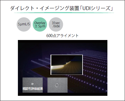 なお、今回のJPCAショーでは、この高精度DIの技術を駆使した、8~10µmL/Sをターゲットとした、次世代CSP向け直描機も併せて発表させていただいております。