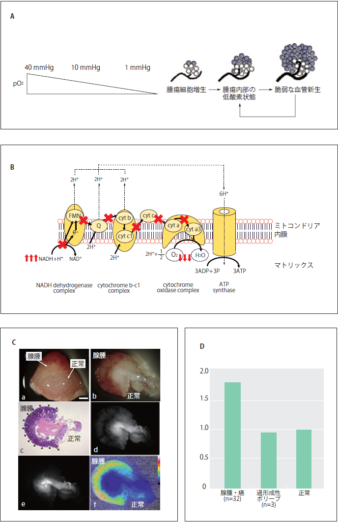 A) 低酸素環境は固形腫瘍に共通した特徴である。がん組織はその発生初期から微小循環動態の欠陥等により恒常的に 低酸素状態にあるといわれている(J. Bull Cancer 2006;93:E73-80)。 B) ミトコンドリア呼吸鎖の模式図。細胞が 低酸素環境にさらされると細胞内NAD+/NADH redox状態は変化し、蛍光を持つNADHが増える。C) ヒト大腸腺腫 イメージング[a: 表面像(白色光)、b: 断面像(白色光)、c: 断面像(HE)、d: 断面像(NADH蛍光)、e: 断面像(レファレンス蛍光)、 f: 断面像(2波長励起蛍光イメージ:レシオ画像=NADH蛍光/レファレンス蛍光)]。2波長励起蛍光イメージング法を用いる ことにより、腫瘍の血管密度や形状の影響を受けない大腸腺腫イメージングが可能(C, D)。Scale bar = 1 mm