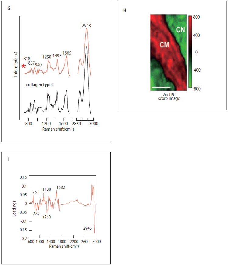A)ラマン散乱の模式図。物質に光を入射したとき、入射光は違う波長で散乱される光をラマン散乱光という。このラマン散乱光は分子固有の分子振動に依存するため、ラマン散乱光を分光することで、分子の同定、構造を推定することが可能。B)心筋細胞のラマンスペクトル。心筋細胞のラマンスペクトルは還元型b5及びc型チトクロームの寄与が大きい。C) HE染色による心筋梗塞の境界領域イメージ。D) 線維染色による心筋梗塞の境界領域イメージ。E)Cのボックス領域の拡大イメージ。F)白色光イメージ。G)Fの線維性の組織(星印)とI型コラーゲンのラマンスペクトルの比較。H)Eの領域についてラマンスペクトル測定後、主成分分析した時の第2主成分ラマンイメージ。I) 主成分分析を適用した時の第2主成分ローディングプロット。正のバンドは還元型b5及びc型チトクローム(751, 1130,1582 cm-1)及び脂質(2854 cm-1)に関連。負のバンドはI型コラーゲン(857, 1250, 2945 cm-1)に関連。スケールバーは50µm(C, D);20 µm(E, F, H)。CM、ラット心筋細胞。