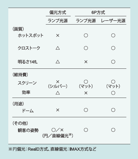 表1に3D方式のなかで現在普及している偏光方式と6P方式の比較をまとめる。6P方式は左右の眼で異なるRGBの波長のセットを使うことで3Dを表現する。この方式は左右のグラスの原色の波長間隔を適切にとることでクロストークの少ない3Dメガネをつくることができるので高画質な3Dとして期待されている。従来光源であるキセノンランプでは、白色光から2組のRGB光を取り出す過程の効率が低いために、明るいスクリーンの実現が困難であったが、レーザーは既に単色度の高い光源なので、最初から波長の間隔を適切に選択した2組のRGBレーザーをつかえばよく、このデメリットはなくなる。しかも、レーザーは高輝度な光源なので数を増やしても光の利用効率を犠牲にすることなく光をプロジェクターの光学系に取り込むことができるので、容易に光量を高めることができる。結果として、従来のランプ式プロジェクターでは実現困難であった3DでDCI規格の14fLのスクリーン光量を実現できている。