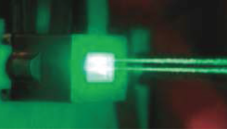 図5に本レーザーの典型的なCW動作時の入出力特性を示す。発振閾値電流は約8 Aであり、電流の増加とともに出力が増加し、約21 Aにおいて3 Wのレーザー出力が得られ、約22 Aでロールオーバーを迎える。ロールオーバー出力は、約3.3 Wである。このレーザーの定格出力は3 Wであり、その時の電力効率は7%である。発振波長として、Nd:YAGレーザーの第二高調波である532 nmを含む521 nmから555 nmの広い範囲が実現している。