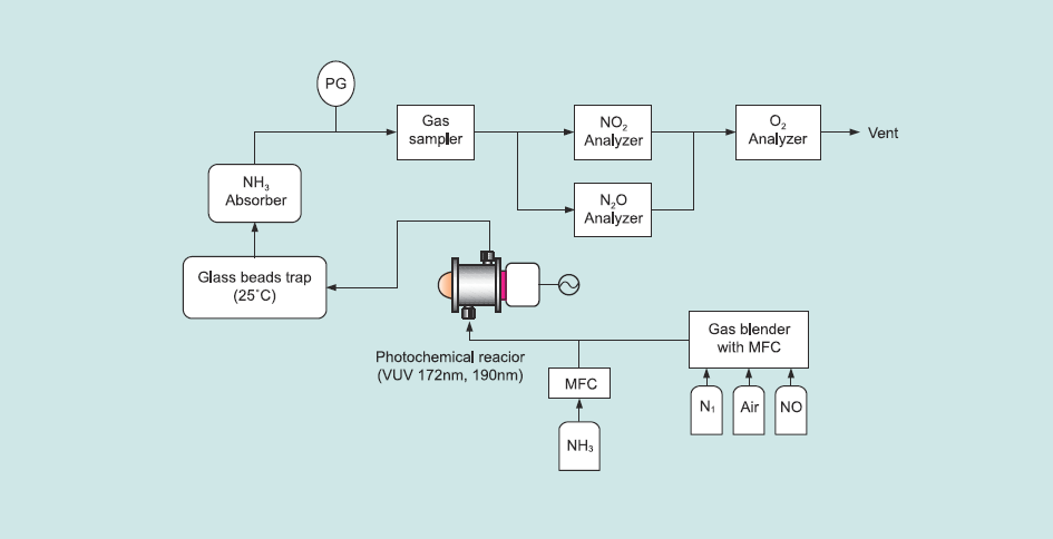 Fig.1に実験装置の概要を示す。装置は、模擬ガス供給部、光反応器、副生成物捕集部、連続式ガス分析装置から成っている。模擬ガス(NO/N2/O2)とNH3をそれぞれマスフローコントローラーで流量制御し、混合した後、円筒型の光反応器に導入した(光反応器の詳細は、次論文7-2-4参照)。反応前後のガス組成は、赤外線式NOx計、赤外線式N2O計、ジルコニア式O2計により連続分析した。