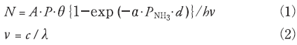 ここでAはランプ表面積[cm2]、Pはランプ出力[W/cm2]、θはガス滞留時間[s]、αはNH3の吸収係数[atm-1cm-1]、PNH3はNH3の分圧[atm]、dは流路幅[cm]、hはプランク定数[Js]、νは振動数[1/s]、cは光の速さ[m/s]、λは紫外線波長[m]。