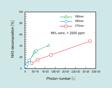 フォトン数が1.5x1020以下では172 nmよりも190、 185 nmの方がNH3分解率が高い。これはNH3の吸収係数αが190 nm > 185 nm > 172 nmであることに起因している。一方、ランプ出力P は、172 nm > 190 nm > 185 nmであるため、172nmのランプが最も多いフォトン数を発生でき、結果NH3分解率も最も高くなった(48.3%)。これより、光脱硝には172 nmのエキシマランプが適していると結論できる。