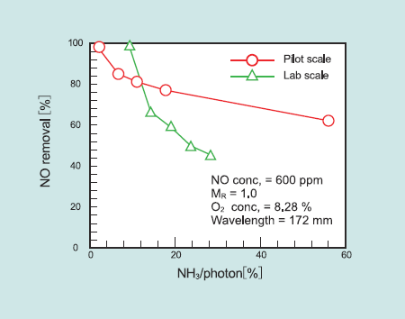 Fig. 4 Effect of NH3/Photon ratio on NO removal between the lab-scale reactor and the pilot-scale reactor.