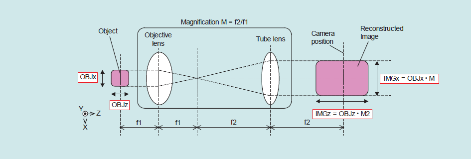 開発したDHMの外観を図1に示す。顕微鏡本体寸法は幅540mmx高さ640mmx奥行き240mm、重量15kgであり、卓上に置ける程度の大きさとなっており、持ち運びも可能である。図2にシステム構成図を示す。システムの特徴として、時系列計測可能で特別な光学素子の不要なオフアクシス光学系を採用していること、対物レンズと結像レンズをアフォーカル系の配置とすることで、通常顕微鏡測定で不可避の球面上の位相歪み6)を生じさせず、デジタルな位相補正7)が不要な構成となっていることが挙げられる。また、図3に示す通り、アフォーカル系は、原理的に単レンズ系と異なり、物体と像の拡大比率が、ピント位置が変化してもずれないため、ホログラム再生計算で得られる再生像の3次元空間データを、顕微鏡物体の寸法に容易に換算できる特徴も持つ。