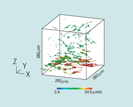 高精度な位相計測可能な機能に加えて、機械的なスキャンを必要とせず一枚のホログラムから任意のピント位置の再生像を得ることができる、2つの高さ計測機能を可能とする本システムの特徴を示した。そして、その特徴を活かしたDHM-PTVのアプリケーションとして、産業上の価値があると見込まれる、液滴内部流動の計測実験を行い、一辺282µmの立方体領域にて、液滴内部の対流が可視化されている様子を確認した。以上より、本システムの3次元計測機器としての有用性を示した。