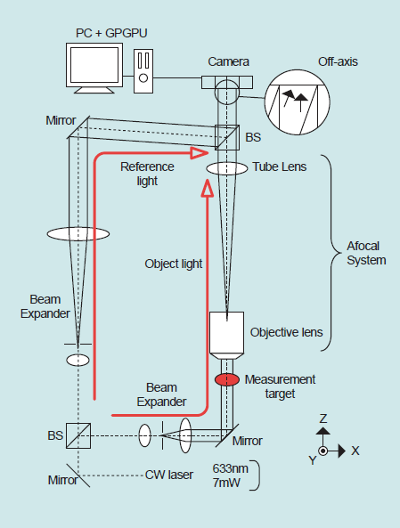 近年のデジタル撮像素子の高精細化や並列演算処理能力の進化を受け、「ダメージレス・リアルタイム・3D」を特徴とするデジタルホログラフィック顕微鏡(DHM)の研究が盛んである1)。また、DHMを計測ツールとして開発し、MEMSや細胞などのバイオメディカル分野へ応用する研究例も知られている2)3)。これらのDHMは、デジタルホログラフィの像再生計算によって得られる複素振幅分布のうち、位相成分を抽出して再生像として用いることで、ナノメートルオーダの高さ変化や屈折率変化を検出可能としている。