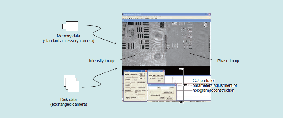 システムに付属するGUIを図5に示す。本ソフトウェアは、入力データとして、カメラからの実時間メモリデータと、システムのカメラ交換などで別途取得した時系列ファイルデータのそれぞれを再生できる設計とした。本ソフトウェアの特徴として、前述のホログラム再生計算プログラムを組み込んでいるため、リアルタイムで(フルフレーム30fps以上で)像解析や再生ができるため、測定しながら結果が画面上に逐次表示、更新される点である。また、もう一つの特徴は、あらかじめ取得されたホログラム時系列画像群に対して、巻き戻しや早送り、そしてデジタルホログラフィならではの像再生距離調整や再生角度調整などを行うための各種GUI部品を実装したことである。加えて、本ソフトウェアでは、図に示すように強度再生像(左画像)と位相再生像(右画像)を同時表示できるようにもなっている。強度再生像と位相再生像はともに256階調グレースケールで表示出力される。このGUIを使うことで、通常のデジタル光学顕微鏡と同等の、リアルタイムな顕微鏡像の観察に加え、デジタルホログラフィならではの、ナノメートルオーダの位相再生像の観察、そして機械的なスキャン動作を必要とせず、任意のピント位置の再生像を得ることができる。