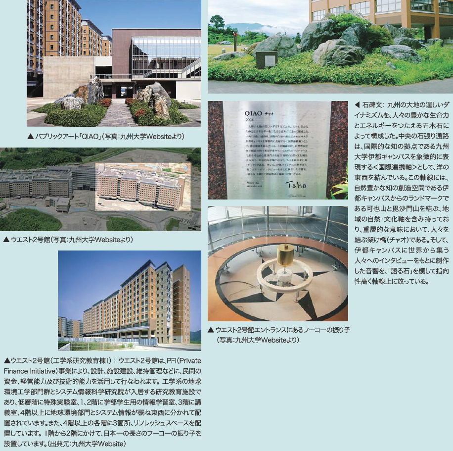 ウエスト2号館を背にした総合学習プラザの前にあるパブリックアート「QIAO」。世界的アーチストたほりつこ氏の作品である。一見、造園のように見えるが、石や草花をモチーフに、住民との綿密な共同作業を通して、地域の活性化を象徴しているという。