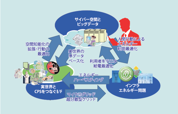 CPSによる持続可能なIT社会の発展(下図)に向けて、このグループでは、光センシングを軸とした光エネルギーハーベストによる無給電センサーや、諸情報の光学情報への変換を可能とする光センシングデバイスの研究を行っている。実世界の膨大な情報を、エネルギーの消費を増大させずにサイバースペースへのビッグデータへと反映させるという、実世界への超分散型インターフェースの構築を目指している。