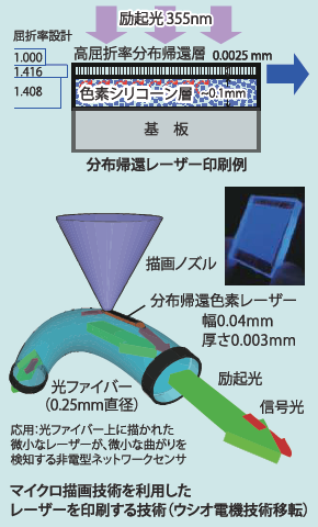 Fig. 8に設計した組み込み型集積レーザーの概念図を示す。PMMAフィルム(125µm厚)を用い、光ファイバをこれに結合してビームを一方向にのみ広げるビーム成型フィルムを発案した。Shaperの端面を光学研磨し、この上にペン描画法により屈折率差を小さく設計した三層を積層描画した。なお、コア膜厚を安定させるため、クラッド層は125µm幅一杯に、コア層は60〜100µm幅に抑え、2層描画後にDFB構造を記録後、第3層をコートした。このように幅125µmのエッジ領域に同系ポリマーを3層積層することは従来のスピンコート等では不可能であり、ペン描画により初めて可能となったと言える。ポストアニール後、ウルトラミクロトーム(Sorvall社、UltraMicrotome MT-1)を用いてレーザーの出射面を作製した。各導波路の屈折率制御は共重合ポリマーp(MMA1-x:HEMAx)で主に行い、屈折率の校正はプリズムカプラー(メトリコン社、Model2010)により波長633 nmに対する実測値を元に行なった.
