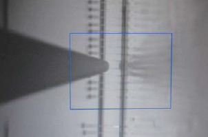 最後に、色素レーザーと流路間のアラインメントを行なうため、流路に流れる色素から蛍光を観測している様子をFig. 12に示す。右の流路は校正用の流路で、左は測定用である。標識色素Cy5®とスペクトル特性が類似している色素として、1,1,3,3,3',3' hexamethylindodicarbocyanineiodide(HIDCI)水溶液を使用して測定を行った。校正用流路での蛍光幅は38µm程度となっている。