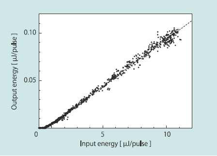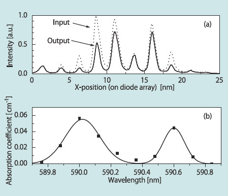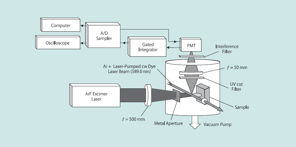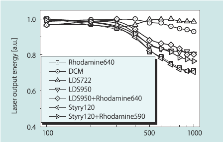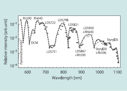 蛍光測定光源用レーザーとしてもう一つ重要な条件として、長波長側の背景光成分の低減がある。励起された蛍光色素の発光波長と同じ波長域のレーザー光成分は観測用フィルタでカットできないためDFBレーザーにおいてどの程度抑えるかが重要である。発振波長よりもおいてどの程度抑えるかが重要である。発振波長よりも10nm長波長側の線強度は通常の色素レーザーでは10-3程度の抑制率であるが、色素濃度を下げるあるいは色素の蛍光波長の長波長域での発振用いることにより,2 x 10-4程度まで低減することができている。